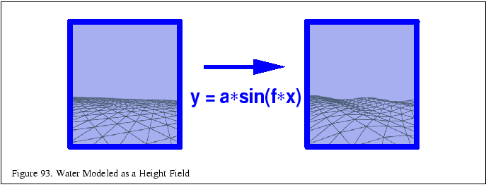 Small swells can be modeled using a texture mapped height field. The height of the vertices can be modulated with a sinusoid to simulate simple wave patterns as showing in Figure 93. The frequency and amplitude of the waves can be varied to achieve different effects. The phase of the sinusoid can be varied over time to create wave motion.