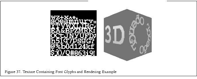 Figure 37 shows an example of a texture image packed with glyphs for rendering text on the left. The right side of the figure is a rendering example using the texture. Note how each glyphs in the rendering example matches the corresponding glyph in the texture.